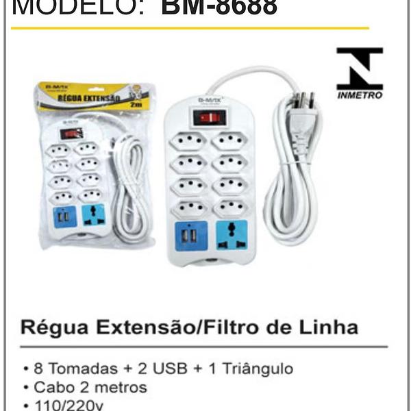 Régua Extensão/Filtro de Linha • 8 Tomadas + 2 USB + 1 Triângulo