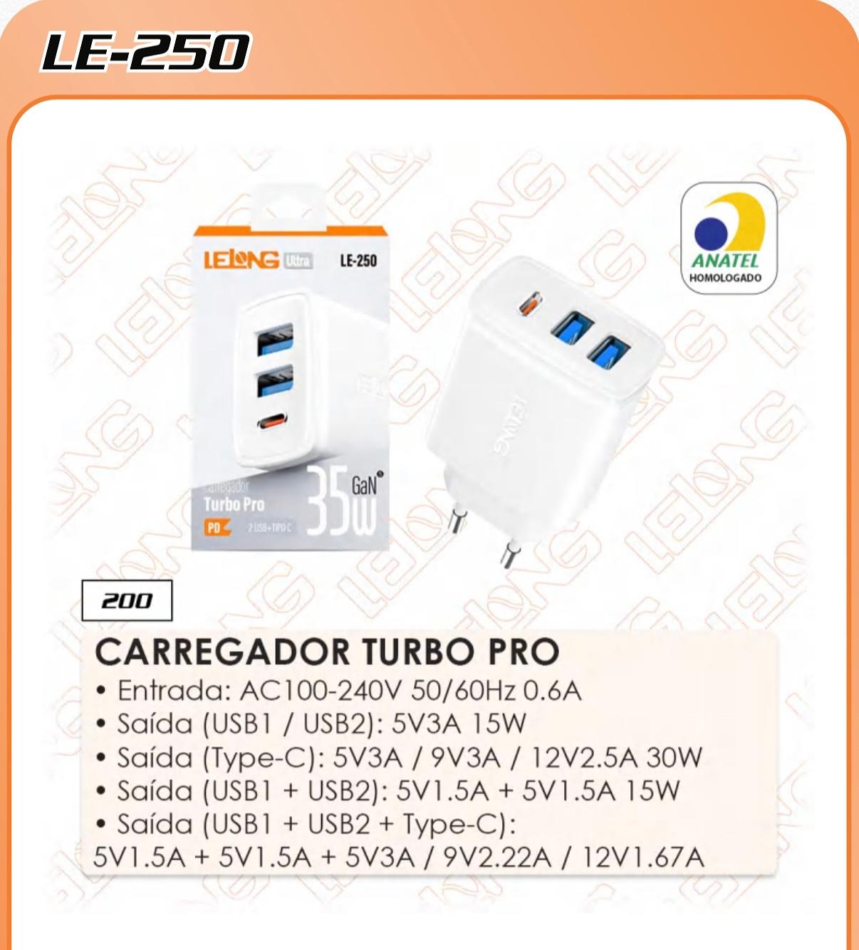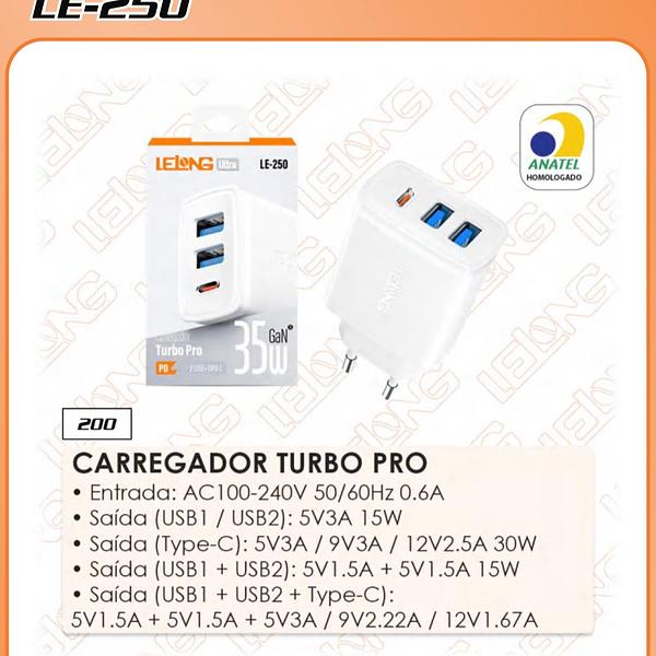 CARREGADOR TURBO PRO • Entrada: AC100-240V 50/60Hz 0.6A • Saída (USB1 / USB2): 5V3A 15W • Saída (Type-C): 5V3A / 9V3A / 12V2.5A 30W